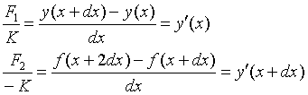 Nun werden die Kräfte zwischen den Massepunkten (in obiger Skizze durch die drei Kästchen dargestellt) betrachtet. Der mittlere Kasten hat die Masse, dm und auf ihn wirkt die Kraft Fg, die aus den Komponenten F1 und F2 besteht.